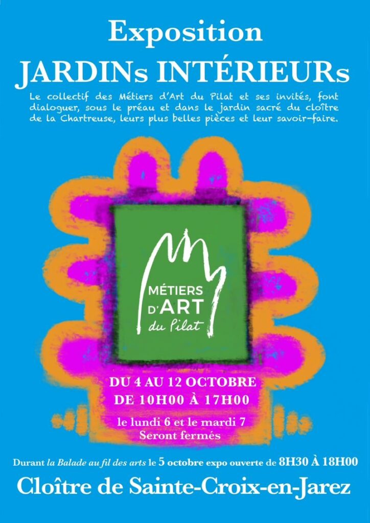 L’association MAP (Métiers d’Art du Pilat) est invitée à exposer au cloitre de Sainte Croix en Jarez du 4 au 12 octobre 2025 et à l’occasion de la célèbre Balade au fil des arts de dimanche 5 octobre. Les horaires: